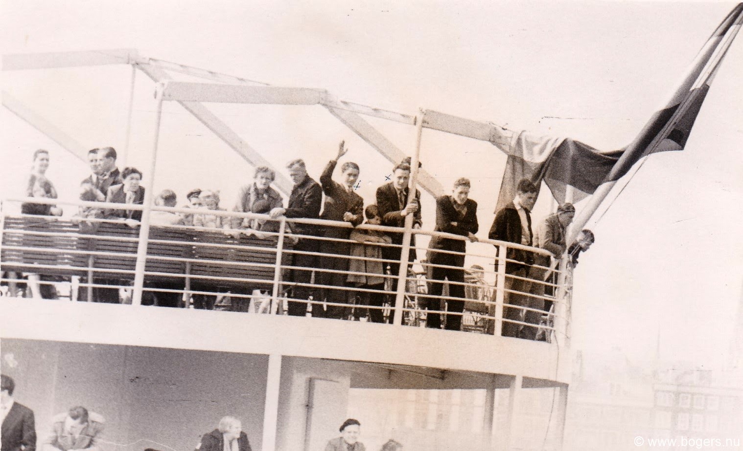 Geert Wijnen gaat emigreren naar Canada. Het vertrek met de boot op 8 april 1953 met de Grote Beer vanuit Rotterdam. X rechts is Geert. Links van Geert Wijnen staat zijn neef Piet van Sprundel. Toen ze daar aankwamen hebben ze de eerste tijd bij een boer in het stro kunnen slapen. Ze hadden niks en er was ook niks geregeld.